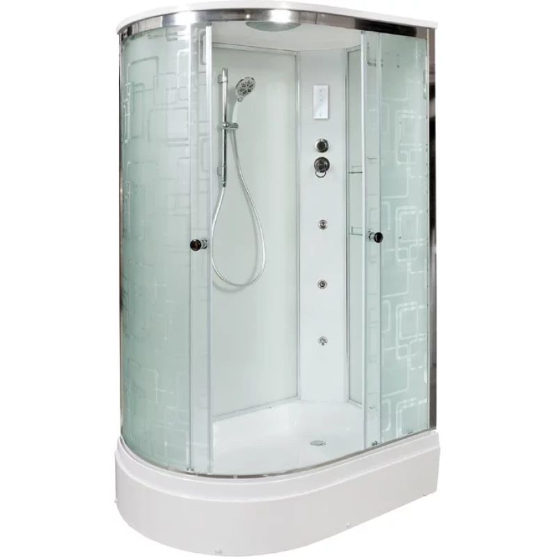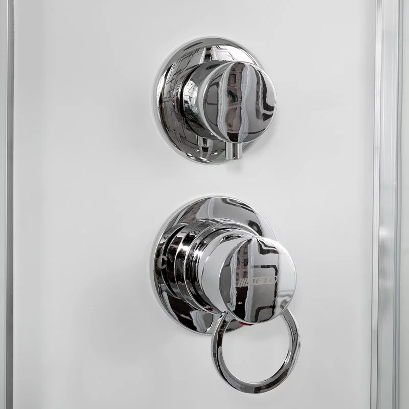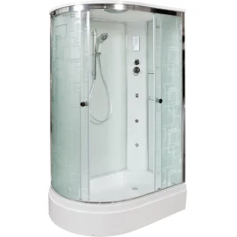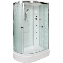 Душевой шланг, Душевая лейка, Держатель для душевой лейки, Полочка, Ручки, Подсветка, Верхний душ, Динамик, Металлический каркас, Поддон, Радио, Смеситель, Сифон, Штанга душевая, Ножки, Зеркало