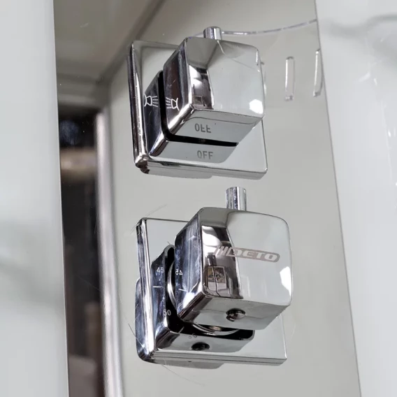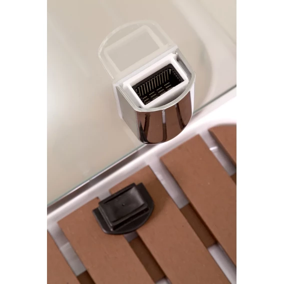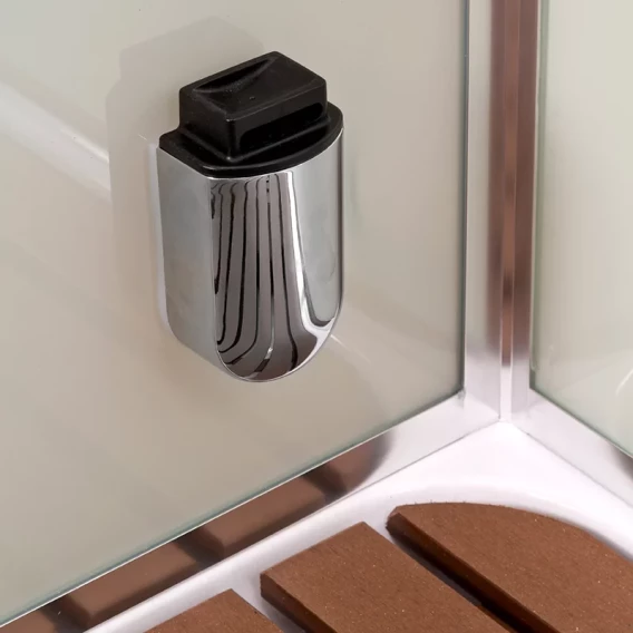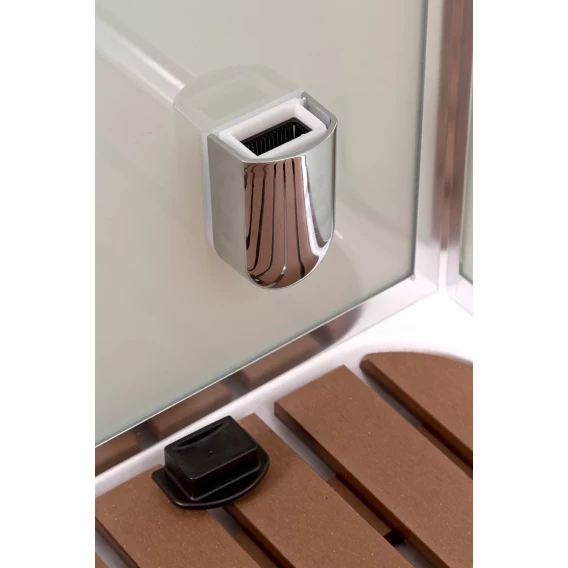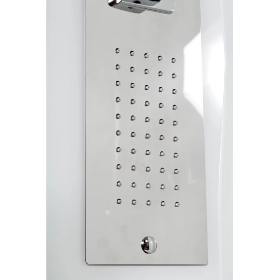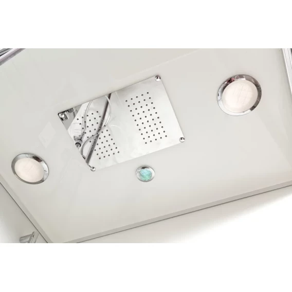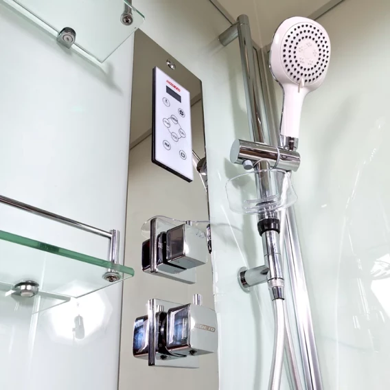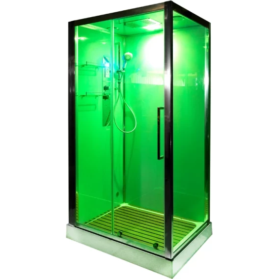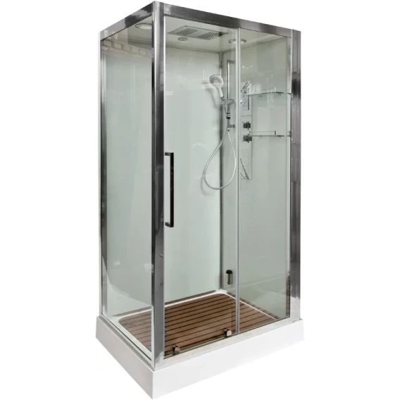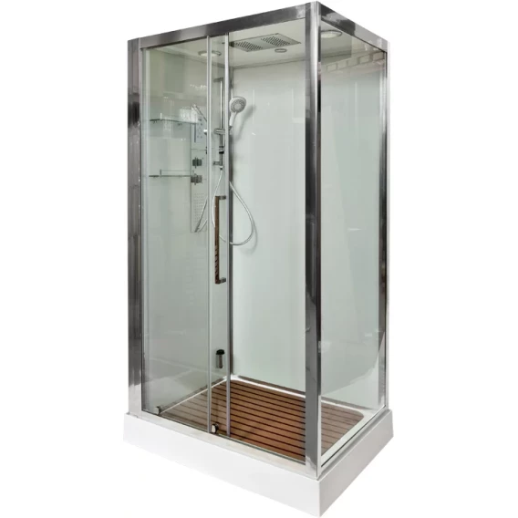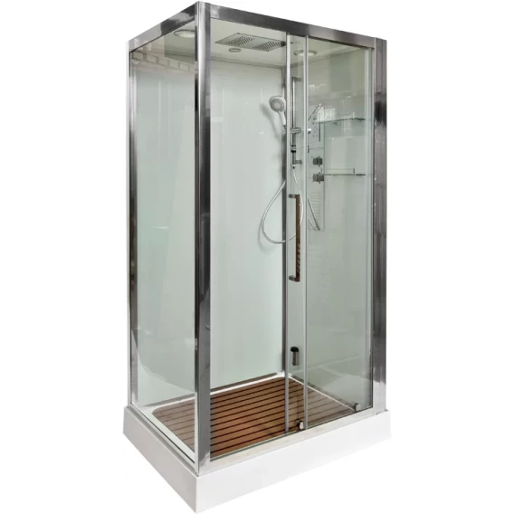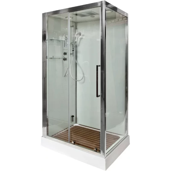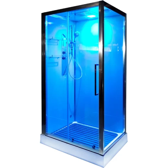 Душевой шланг, Душевая лейка, Держатель для душевой лейки, Полочка, Ручки, Подсветка, Верхний душ, Динамик, Металлический каркас, Поддон, Радио, Смеситель, Сифон, Мыльница, Штанга душевая, Ножки, Зеркало, Настил