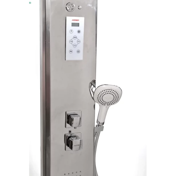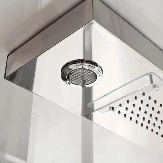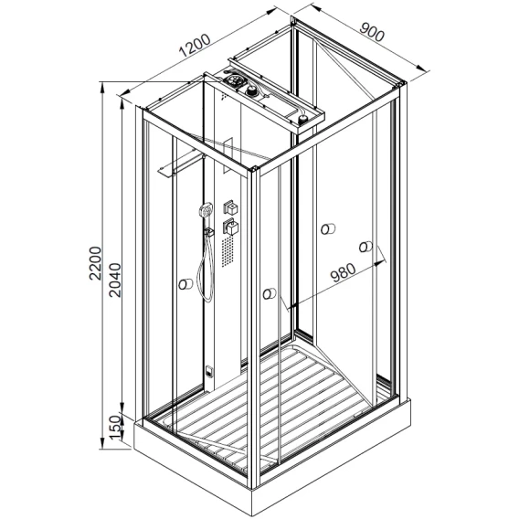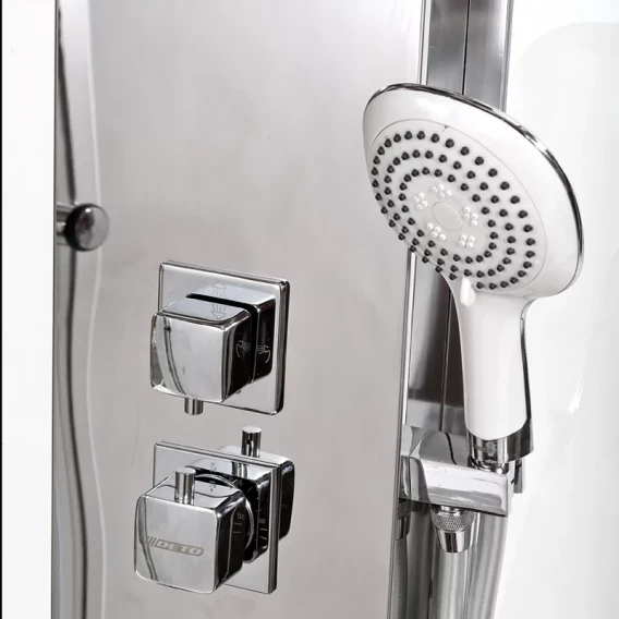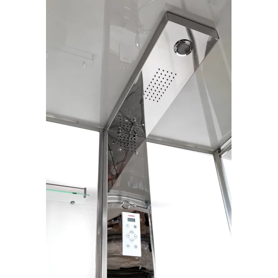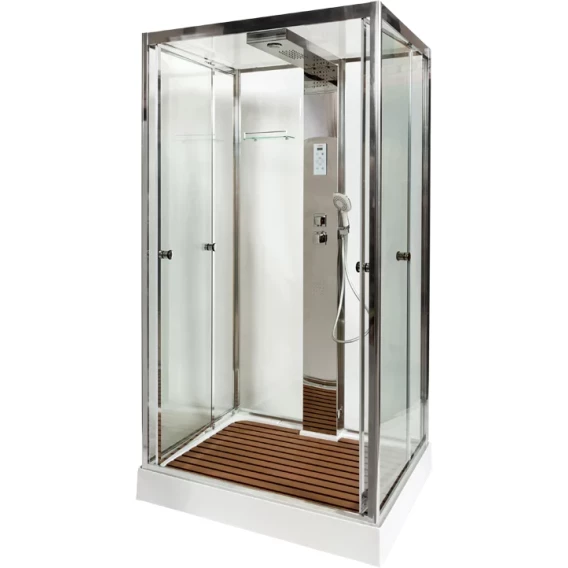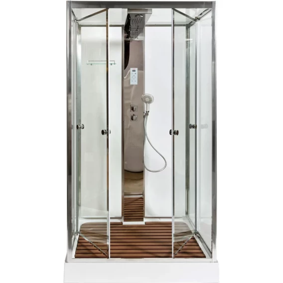 Душевой шланг, Душевая лейка, Подключение для душевого шланга с держателем, Полочка, Ручки, Подсветка, Верхний душ, Динамик, Металлический каркас, Поддон, Радио, Смеситель, Сифон, Ножки, Настил