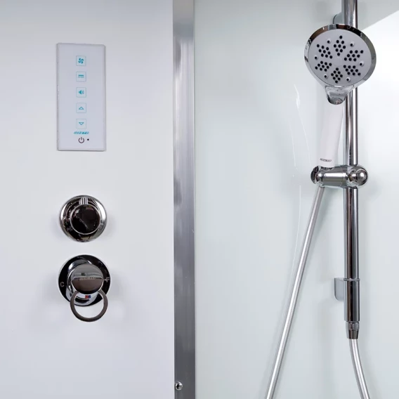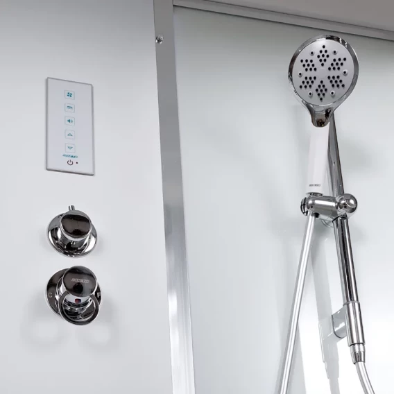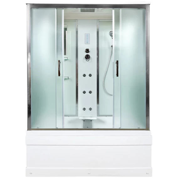 Душевой шланг, Душевая лейка, Держатель для душевой лейки, Полочка, Ручки, Подсветка, Верхний душ, Динамик, Металлический каркас, Поддон, Сиденье, Радио, Смеситель, Слив-перелив, Штанга душевая, Ножки, Зеркало