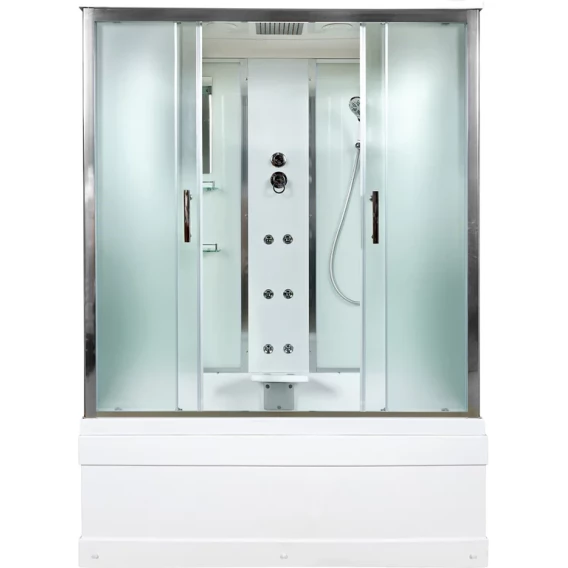 Душевой шланг, Душевая лейка, Держатель для душевой лейки, Полочка, Ручки, Верхний душ, Металлический каркас, Поддон, Сиденье, Смеситель, Слив-перелив, Штанга душевая, Ножки, Зеркало