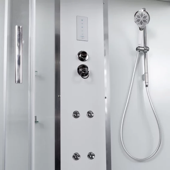 Душевой шланг, Душевая лейка, Держатель для душевой лейки, Полочка, Ручки, LED подсветка, Верхний душ, Динамик, Металлический каркас, Поддон, Сиденье, Радио, Смеситель, Слив-перелив, Штанга душевая, Ножки, Зеркало