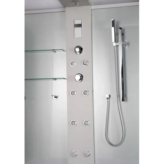 Душевой шланг, Душевая лейка, Держатель для душевой лейки, Подключение для душевого шланга, Полочка, Ручки, Верхний душ, Крючок, Bluetooth, Металлический каркас, Сиденье, Радио, Излив, Слив-перелив, Штанга душевая, Ножки