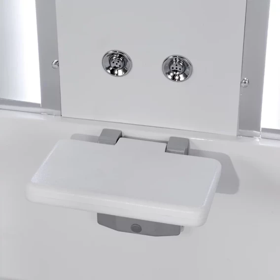 Душевой шланг, Душевая лейка, Держатель для душевой лейки, Полочка, Ручки, Подсветка, Верхний душ, Динамик, Металлический каркас, Поддон, Сиденье, Радио, Смеситель, Слив-перелив, Штанга душевая, Ножки, Зеркало