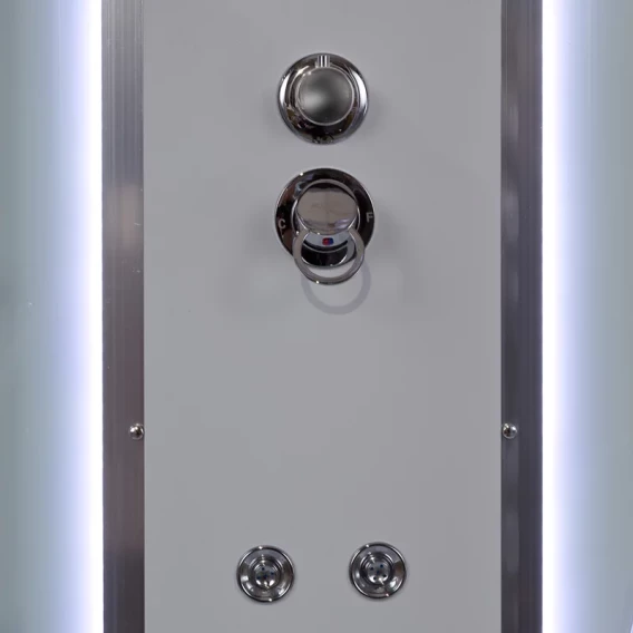 Душевой шланг, Душевая лейка, Держатель для душевой лейки, Полочка, Ручки, LED подсветка, Верхний душ, Динамик, Металлический каркас, Поддон, Сиденье, Радио, Смеситель, Слив-перелив, Штанга душевая, Ножки, Зеркало
