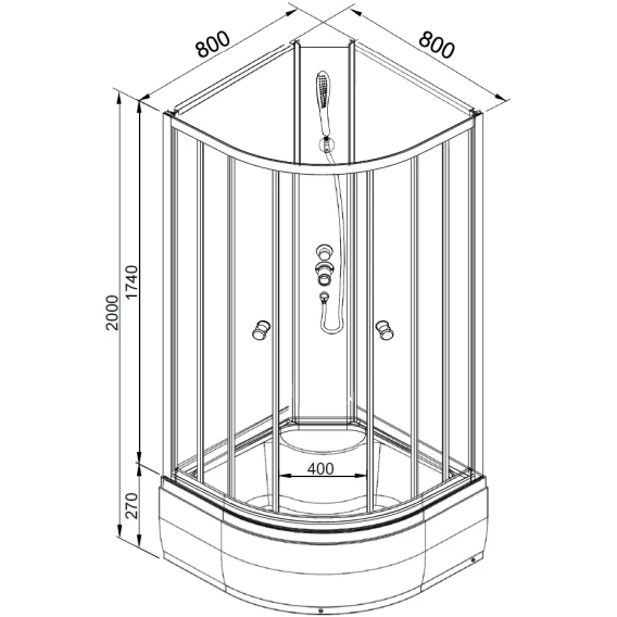 Душевой шланг, Душевая лейка, Держатель для душевой лейки, Подключение для душевого шланга, Ручки, Металлический каркас, Поддон, Смеситель, Сифон, Ножки