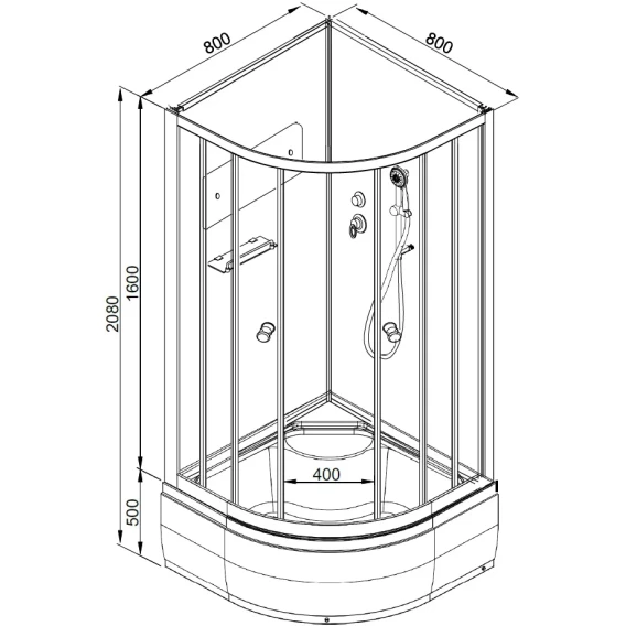 Душевой шланг, Душевая лейка, Держатель для душевой лейки, Полочка, Ручки, Крючок, Металлический каркас, Поддон, Сиденье, Смеситель, Сифон, Штанга душевая, Ножки, Зеркало