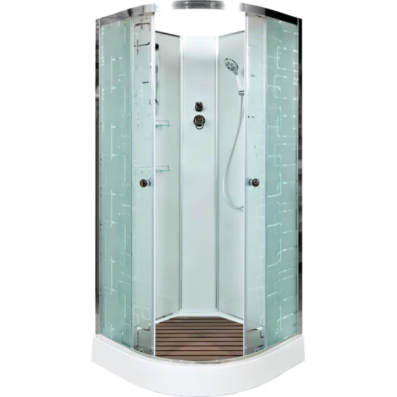 Душевой шланг, Душевая лейка, Держатель для душевой лейки, Полочка, Ручки, Металлический каркас, Поддон, Смеситель, Сифон, Штанга душевая, Ножки, Зеркало, Настил