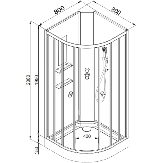 Душевой шланг, Душевая лейка, Держатель для душевой лейки, Полочка, Ручки, Металлический каркас, Поддон, Смеситель, Сифон, Штанга душевая, Ножки, Зеркало, Настил