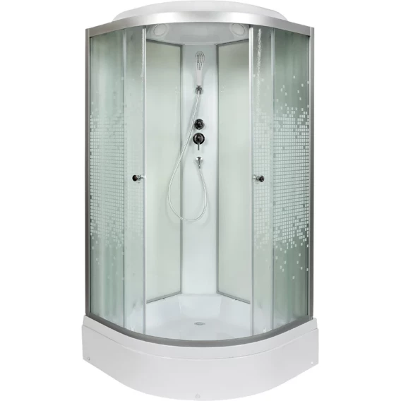 Душевой шланг, Душевая лейка, Держатель для душевой лейки, Подключение для душевого шланга, Ручки, Верхний душ, Металлический каркас, Поддон, Смеситель, Сифон, Ножки