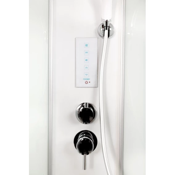 Душевой шланг, Душевая лейка, Держатель для душевой лейки, Подключение для душевого шланга, Ручки, Подсветка, Верхний душ, Динамик, Металлический каркас, Поддон, Радио, Смеситель, Сифон, Ножки