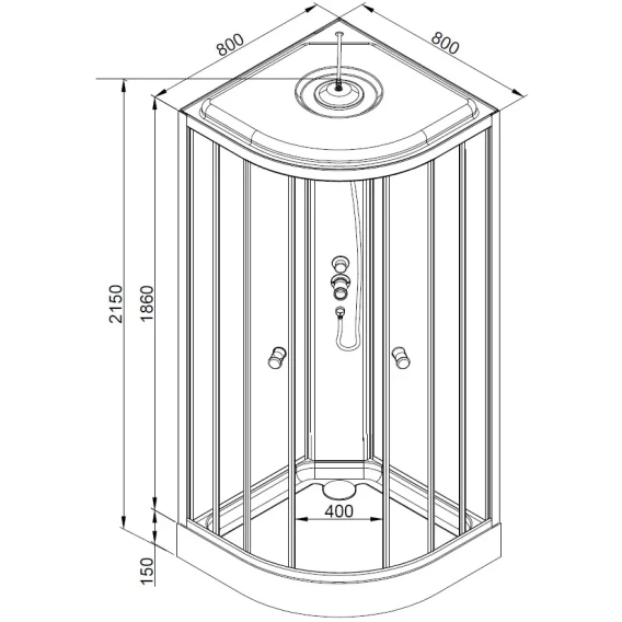 Душевой шланг, Душевая лейка, Держатель для душевой лейки, Подключение для душевого шланга, Ручки, Верхний душ, Металлический каркас, Поддон, Смеситель, Сифон, Ножки