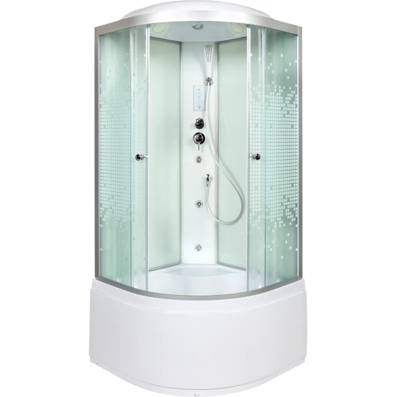Душевой шланг, Душевая лейка, Держатель для душевой лейки, Подключение для душевого шланга, Ручки, Подсветка, Верхний душ, Динамик, Металлический каркас, Поддон, Сиденье, Радио, Смеситель, Сифон, Ножки