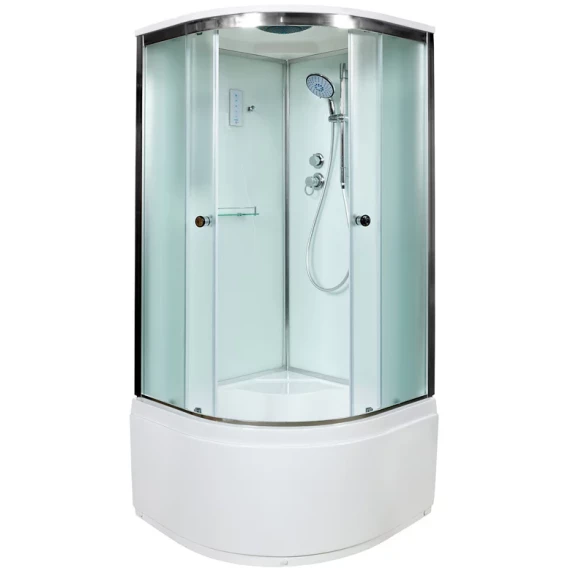 Душевой шланг, Душевая лейка, Держатель для душевой лейки, Полочка, Ручки, Подсветка, Верхний душ, Крючок, Динамик, Металлический каркас, Поддон, Сиденье, Радио, Смеситель, Сифон, Штанга душевая, Ножки, Зеркало