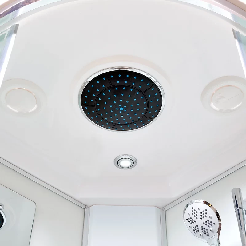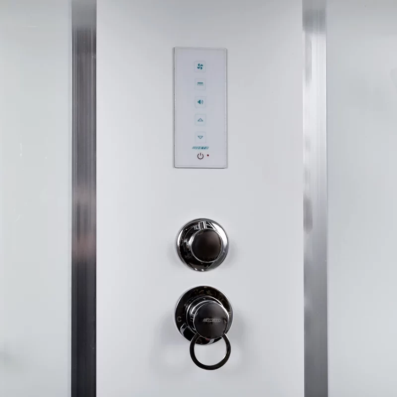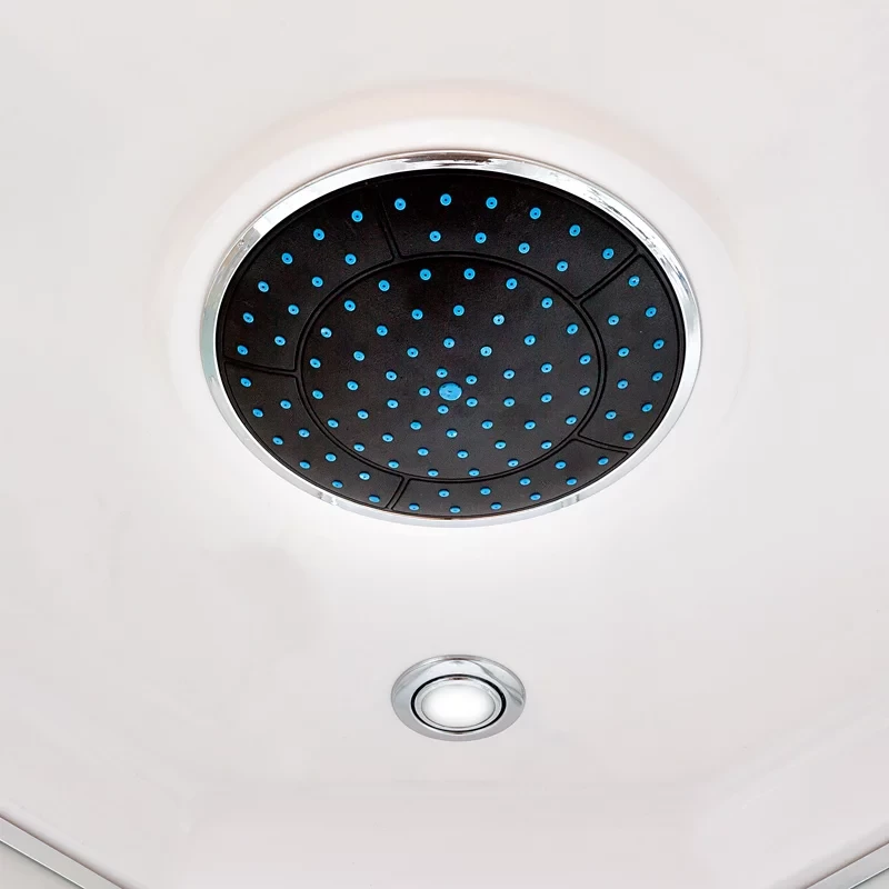 Душевой шланг, Душевая лейка, Держатель для душевой лейки, Полочка, Ручки, Подсветка, Верхний душ, Динамик, Металлический каркас, Поддон, Радио, Смеситель, Сифон, Штанга душевая, Ножки, Зеркало, Настил