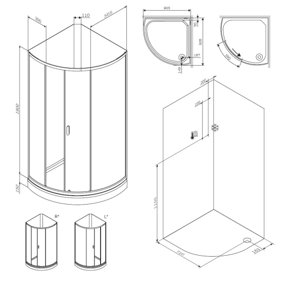Душевой шланг, Душевая лейка, Держатель для душевой лейки, Подключение для душевого шланга, Поддон, Смеситель, Сифон, Ножки