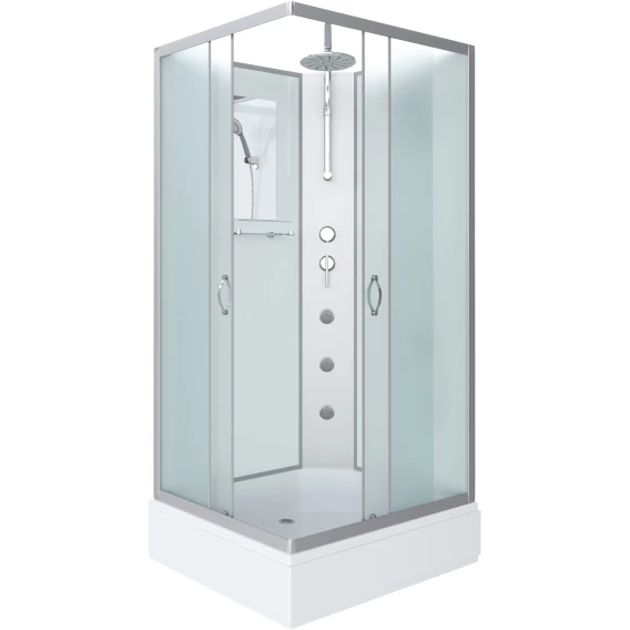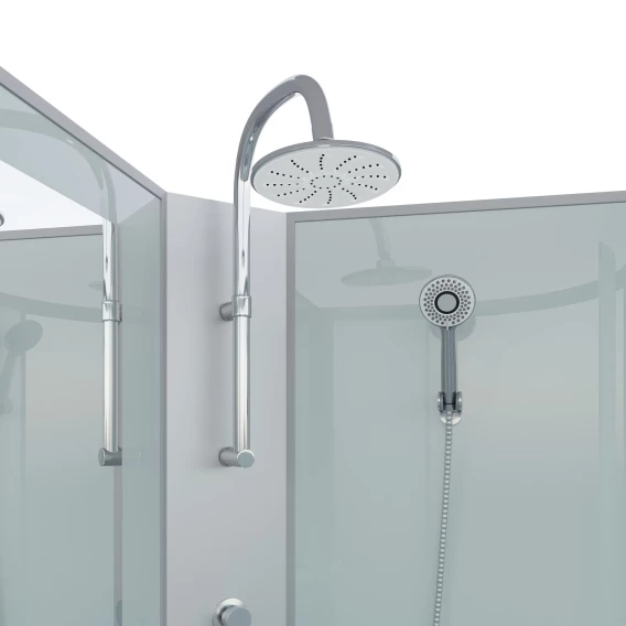 Душевой шланг, Душевая лейка, Держатель для душевой лейки, Подключение для душевого шланга, Полочка, Верхний душ, Поддон, Смеситель, Сифон, Кронштейн, Ножки, Зеркало