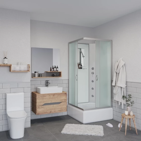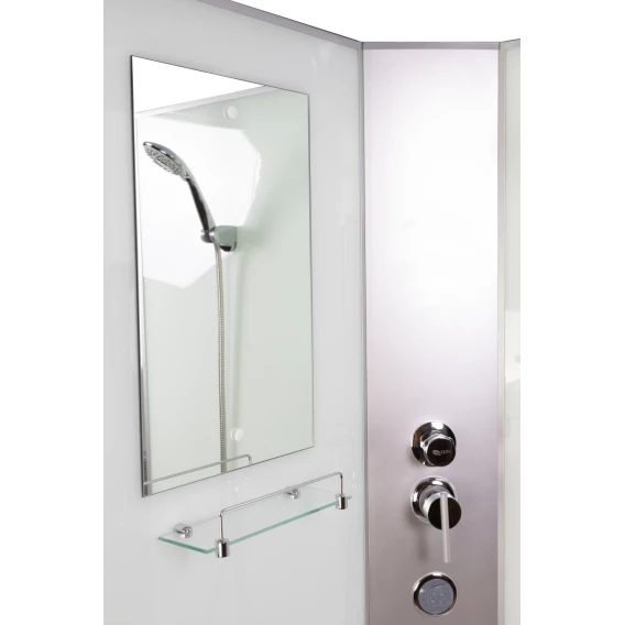 Душевой шланг, Душевая лейка, Держатель для душевой лейки, Подключение для душевого шланга, Полочка, Поддон, Сиденье, Смеситель, Сифон, Ножки, Зеркало