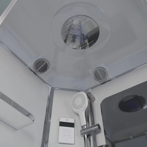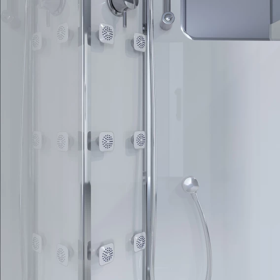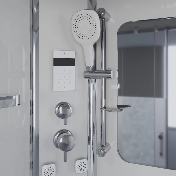 Душевой шланг, Душевая лейка, Держатель для душевой лейки, Подключение для душевого шланга, Полочка, Верхний душ, Динамик, Поддон, Радио, Смеситель, Сифон, Мыльница, Штанга душевая, Ножки, Зеркало