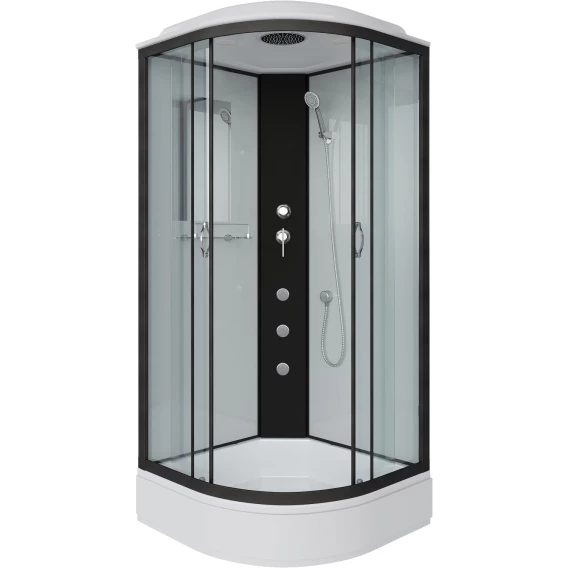 Душевой шланг, Душевая лейка, Держатель для душевой лейки, Подключение для душевого шланга, Полочка, Верхний душ, Поддон, Смеситель, Сифон, Ножки, Зеркало