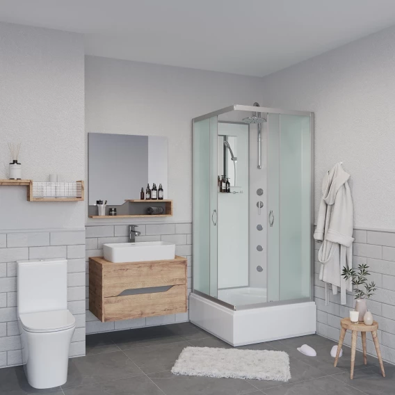 Душевой шланг, Душевая лейка, Держатель для душевой лейки, Подключение для душевого шланга, Полочка, Верхний душ, Поддон, Сиденье, Смеситель, Сифон, Кронштейн, Ножки, Зеркало