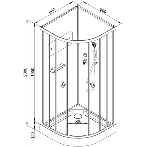 Душевой шланг, Душевая лейка, Держатель для душевой лейки, Полочка, Ручки, Крючок, Металлический каркас, Поддон, Смеситель, Сифон, Штанга душевая, Ножки, Зеркало, Настил