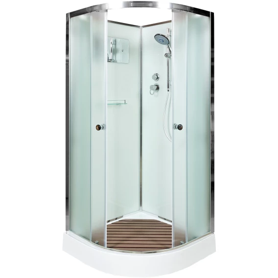 Душевой шланг, Душевая лейка, Держатель для душевой лейки, Полочка, Ручки, Крючок, Металлический каркас, Поддон, Смеситель, Сифон, Штанга душевая, Ножки, Зеркало, Настил