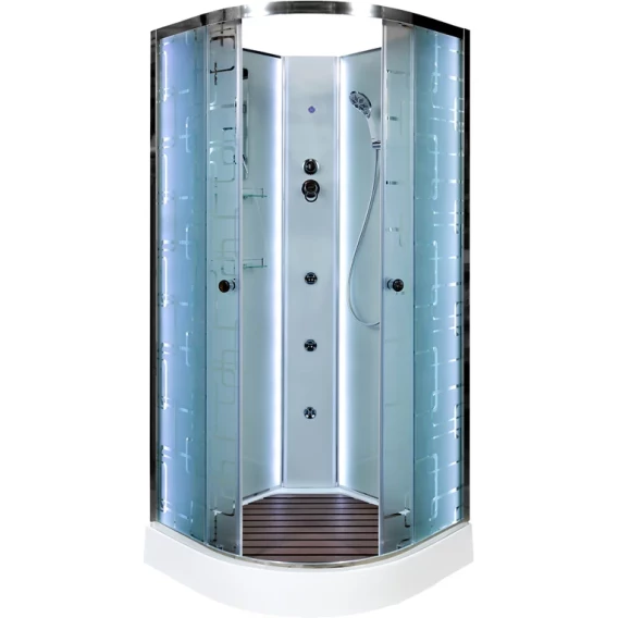 Душевой шланг, Душевая лейка, Держатель для душевой лейки, Полочка, Ручки, LED подсветка, Металлический каркас, Поддон, Смеситель, Сифон, Штанга душевая, Ножки, Зеркало, Настил