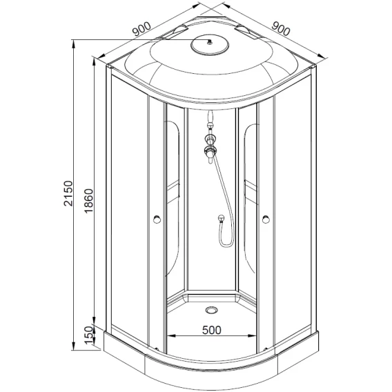 Душевой шланг, Душевая лейка, Держатель для душевой лейки, Подключение для душевого шланга, Ручки, LED подсветка, Верхний душ, Динамик, Металлический каркас, Поддон, Радио, Смеситель, Сифон, Ножки