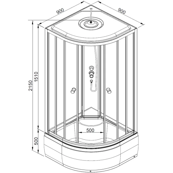 Душевой шланг, Душевая лейка, Держатель для душевой лейки, Подключение для душевого шланга, Ручки, Верхний душ, Металлический каркас, Поддон, Сиденье, Смеситель, Сифон, Ножки