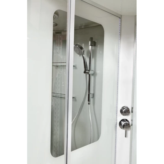 Душевой шланг, Душевая лейка, Держатель для душевой лейки, Полочка, Ручки, Верхний душ, Металлический каркас, Поддон, Смеситель, Сифон, Штанга душевая, Ножки, Зеркало, Настил
