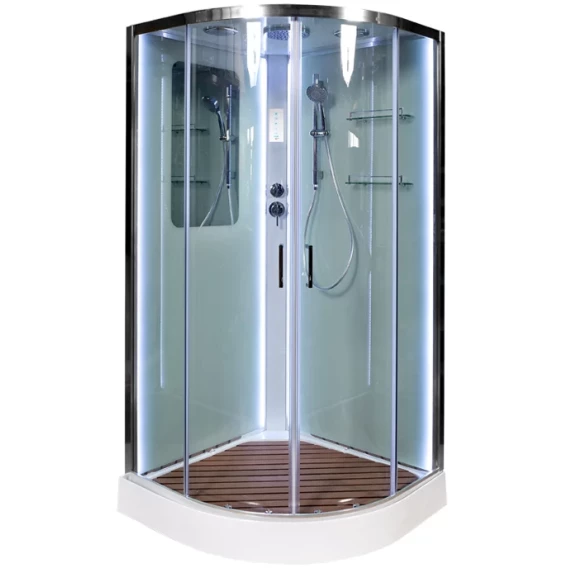 Душевой шланг, Душевая лейка, Держатель для душевой лейки, Полочка, Ручки, LED подсветка, Верхний душ, Динамик, Металлический каркас, Поддон, Радио, Смеситель, Сифон, Штанга душевая, Ножки, Зеркало, Настил