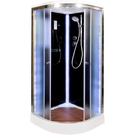 Душевой шланг, Душевая лейка, Держатель для душевой лейки, Полочка, Ручки, LED подсветка, Верхний душ, Крючок, Динамик, Металлический каркас, Поддон, Радио, Смеситель, Сифон, Штанга душевая, Ножки, Зеркало, Настил