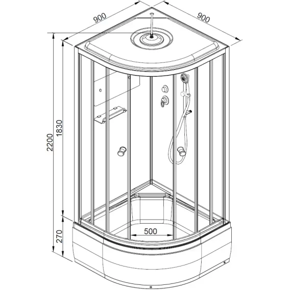 Душевой шланг, Душевая лейка, Держатель для душевой лейки, Полочка, Ручки, LED подсветка, Верхний душ, Крючок, Динамик, Металлический каркас, Поддон, Радио, Смеситель, Сифон, Штанга душевая, Ножки, Зеркало