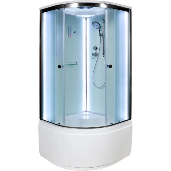 Душевой шланг, Душевая лейка, Держатель для душевой лейки, Полочка, Ручки, LED подсветка, Верхний душ, Крючок, Динамик, Металлический каркас, Поддон, Сиденье, Радио, Смеситель, Сифон, Штанга душевая, Ножки, Зеркало