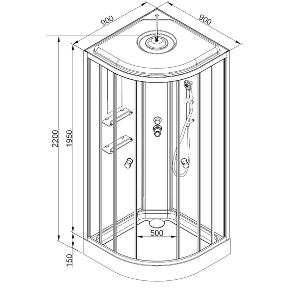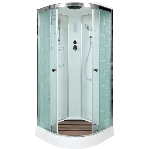 Душевой шланг, Душевая лейка, Держатель для душевой лейки, Полочка, Ручки, Подсветка, Верхний душ, Динамик, Металлический каркас, Поддон, Радио, Смеситель, Сифон, Штанга душевая, Ножки, Зеркало, Настил