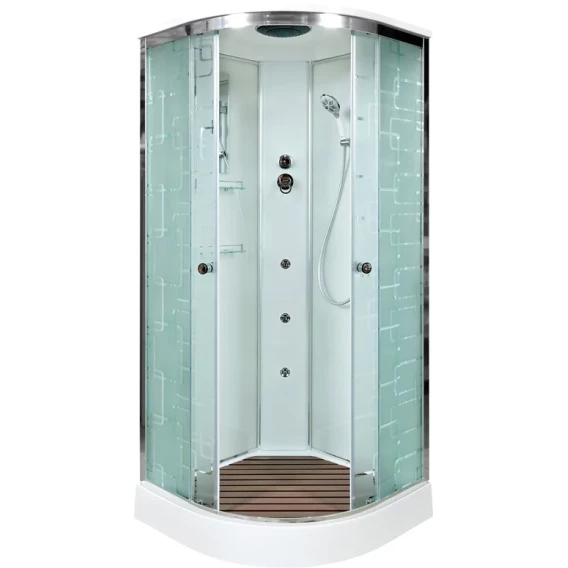 Душевой шланг, Душевая лейка, Держатель для душевой лейки, Полочка, Ручки, Верхний душ, Металлический каркас, Поддон, Смеситель, Сифон, Штанга душевая, Ножки, Зеркало, Настил