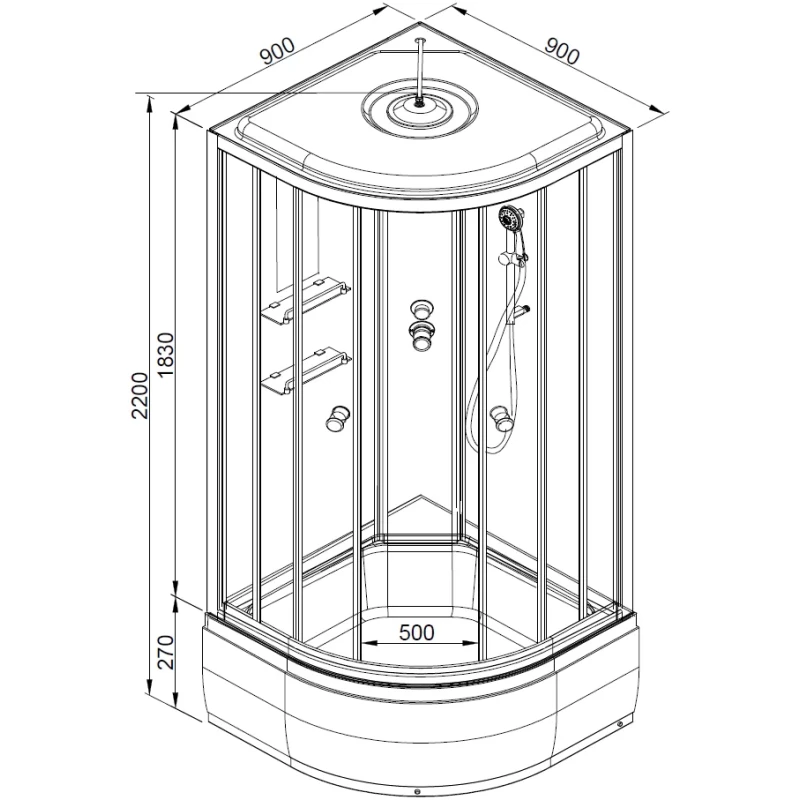 Душевой шланг, Душевая лейка, Держатель для душевой лейки, Полочка, Ручки, Подсветка, Верхний душ, Динамик, Металлический каркас, Поддон, Радио, Смеситель, Сифон, Штанга душевая, Ножки, Зеркало