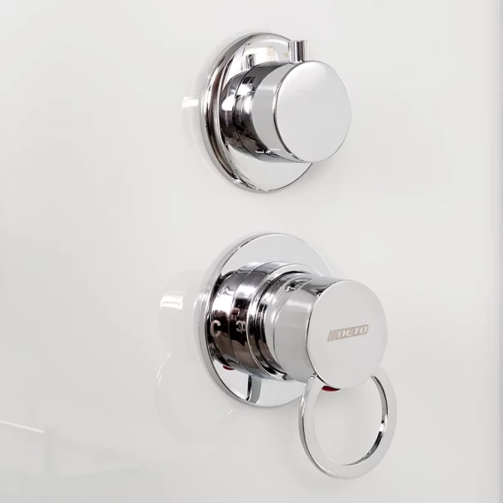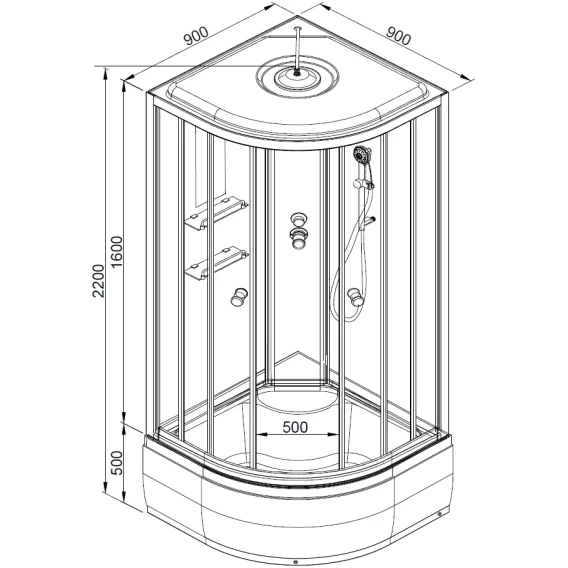 Душевой шланг, Душевая лейка, Держатель для душевой лейки, Полочка, Ручки, Подсветка, Верхний душ, Динамик, Металлический каркас, Поддон, Сиденье, Радио, Смеситель, Сифон, Штанга душевая, Ножки, Зеркало