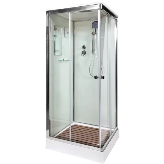 Душевой шланг, Душевая лейка, Держатель для душевой лейки, Полочка, Ручки, Подсветка, Верхний душ, Крючок, Динамик, Металлический каркас, Поддон, Радио, Смеситель, Сифон, Штанга душевая, Ножки, Зеркало, Настил