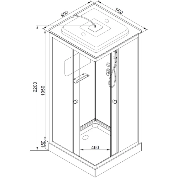 Душевой шланг, Душевая лейка, Держатель для душевой лейки, Полочка, Ручки, LED подсветка, Верхний душ, Крючок, Динамик, Металлический каркас, Поддон, Радио, Смеситель, Сифон, Штанга душевая, Ножки, Зеркало, Настил