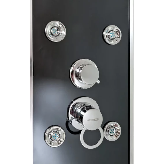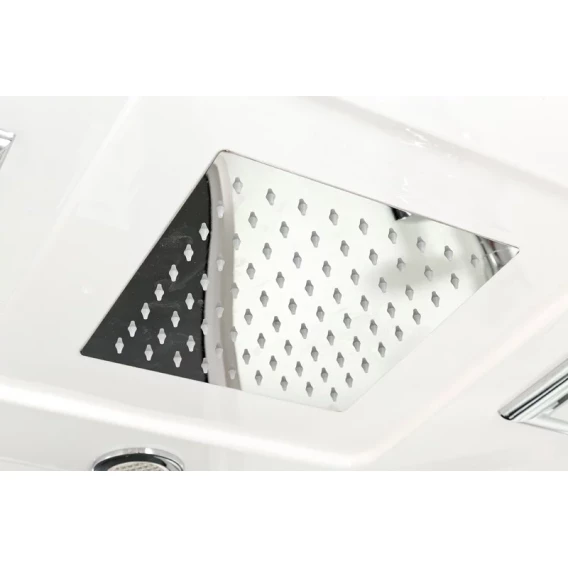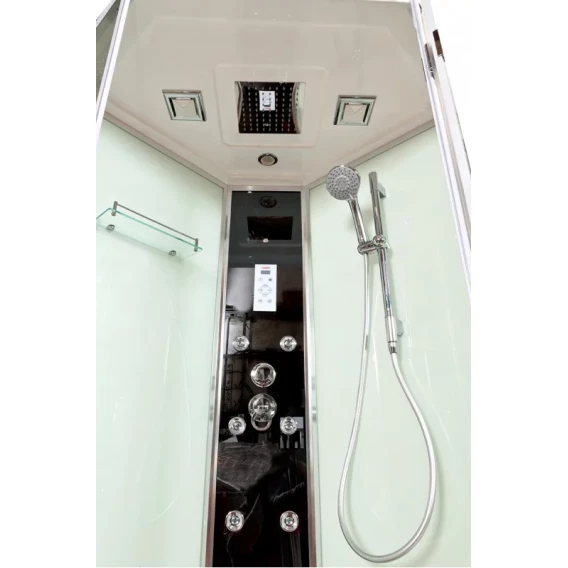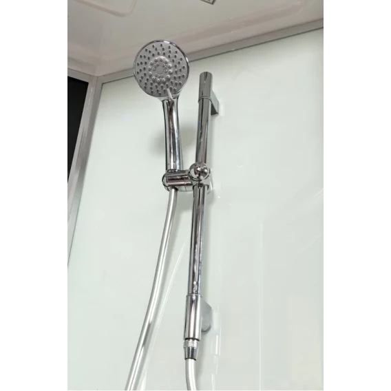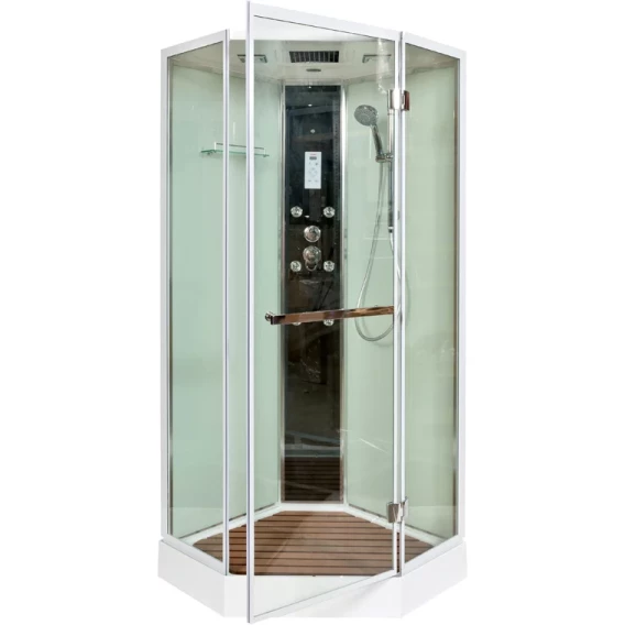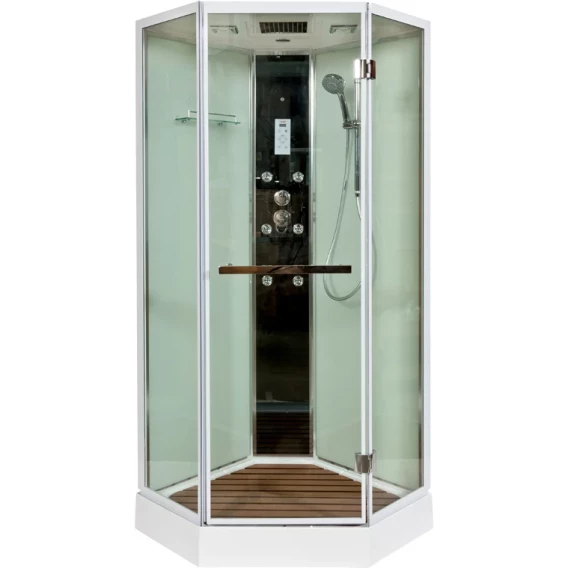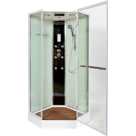 Душевой шланг, Душевая лейка, Держатель для душевой лейки, Полочка, Подсветка, Верхний душ, Динамик, Металлический каркас, Ручка, Поддон, Радио, Смеситель, Сифон, Штанга душевая, Ножки, Настил