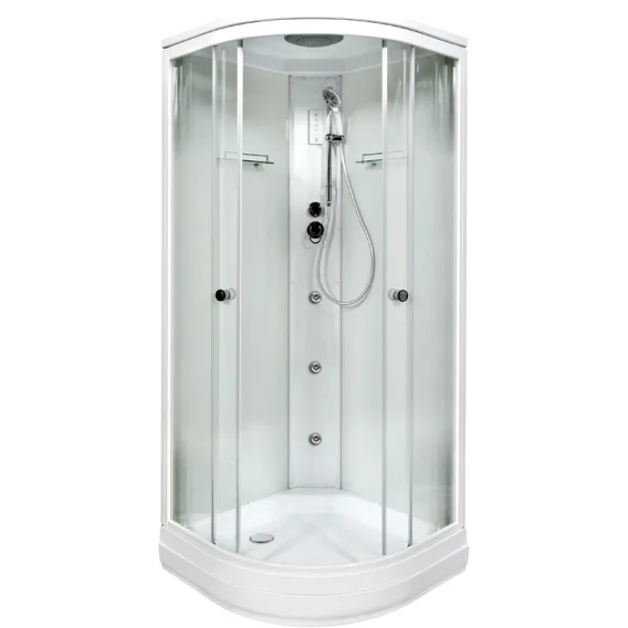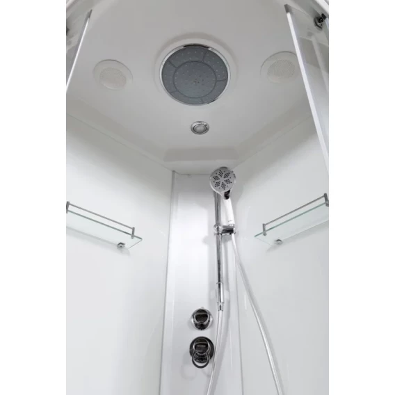 Душевой шланг, Душевая лейка, Держатель для душевой лейки, Полочка, Ручки, Подсветка, Верхний душ, Динамик, Металлический каркас, Поддон, Радио, Смеситель, Сифон, Штанга душевая, Ножки