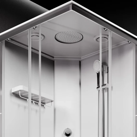 Душевой шланг, Душевая лейка, Держатель для душевой лейки, Подключение для душевого шланга, Полочка, Ручки, Верхний душ, Крючок, Металлический каркас, Поддон, Смеситель, Сифон, Штанга душевая, Ножки
