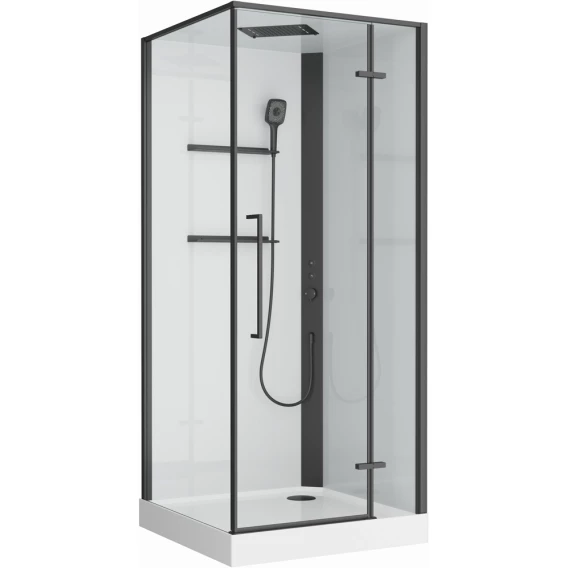 ● Кабина имеет компактные и удобные габариты — 900×900 мм по основанию и высоту 2125 мм, что позволяет ей вписаться даже в небольшое пространство стандартного санузла.