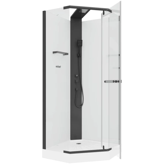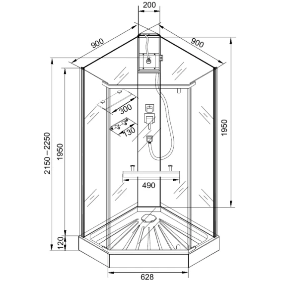 Душевой шланг, Душевая лейка, Держатель для душевой лейки, Подключение для душевого шланга, Полочка, Верхний душ, Крючок, Ручка, Поддон, Смеситель, Сифон, Штанга душевая, Ножки