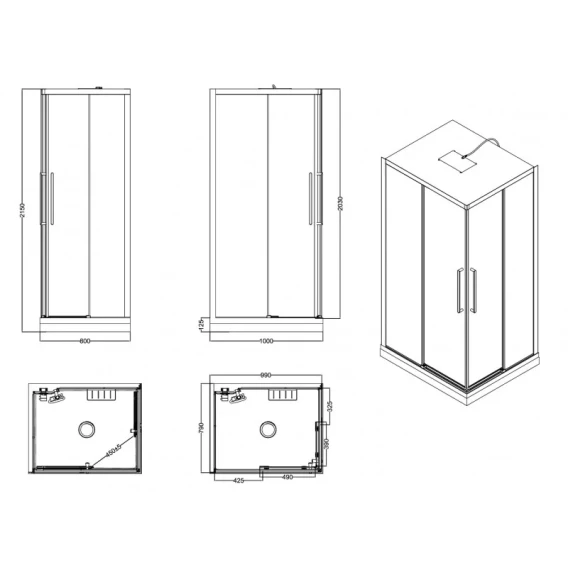 Душевой шланг, Душевая лейка, Держатель для душевой лейки, Подключение для душевого шланга, Полочка, Ручки, Верхний душ, Панель для поддона, Поддон, Смеситель, Сифон, Штанга душевая, Ножки, Зеркало