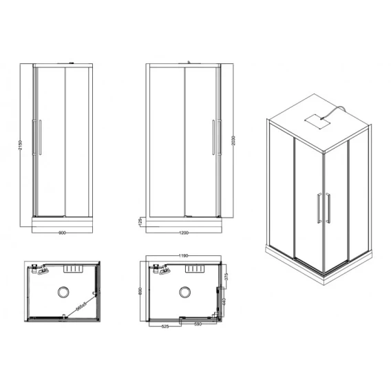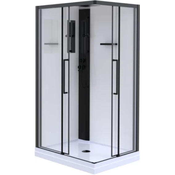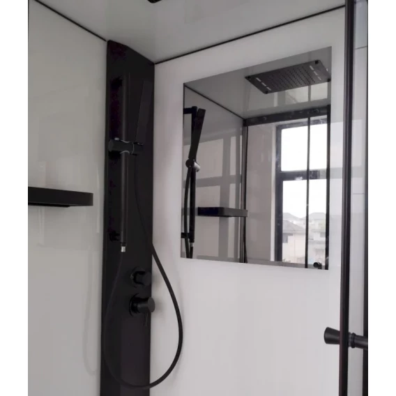 Душевой шланг, Душевая лейка, Держатель для душевой лейки, Подключение для душевого шланга, Полочка, Ручки, Верхний душ, Панель для поддона, Поддон, Смеситель, Сифон, Штанга душевая, Ножки, Зеркало