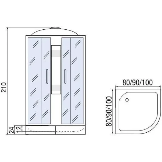 Душевой шланг, Душевая лейка, Держатель для душевой лейки, Подключение для душевого шланга, Полочка, Ручки, Верхний душ, Металлический каркас, Поддон, Смеситель, Сифон, Ножки