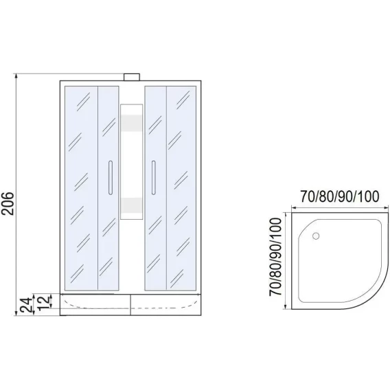 Душевой шланг, Душевая лейка, Держатель для душевой лейки, Подключение для душевого шланга, Полочка, Ручки, Металлический каркас, Поддон, Смеситель, Сифон, Ножки